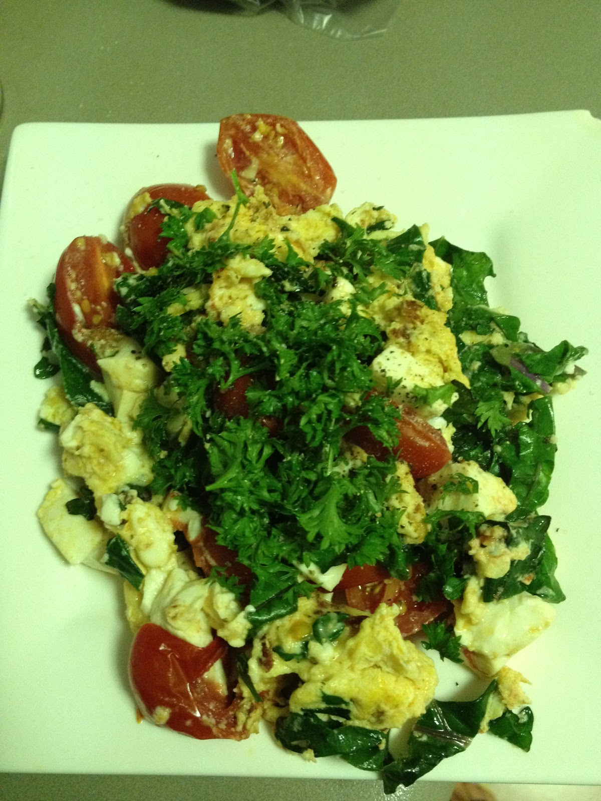Beat the eggs and fry off in a preheated pan. Add in the various veges and or herbs are also great and cook. Add in the pasta and the tamari sauce and gently stir through until well combined.